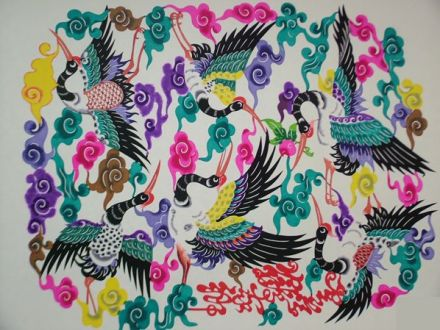 染色剪纸:也就是通常所说的彩色剪纸,其方法是先用吸水性好的白纸(最好是生宣纸)剪刻,再用广告色渲染(这种染法只能一次染一张)。